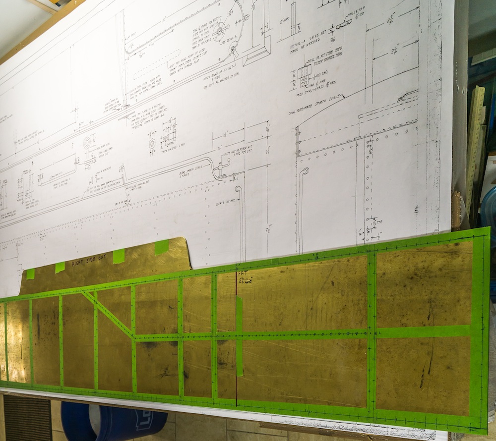 The two sides for the tender have been cut from the brass sheet. There is extra material front and back to bend around the corners. The extra material in the front will form the sides of the coal bunker. I have marked the 414 rivet holes on the side of the sheets, which have been taped together for drilling.